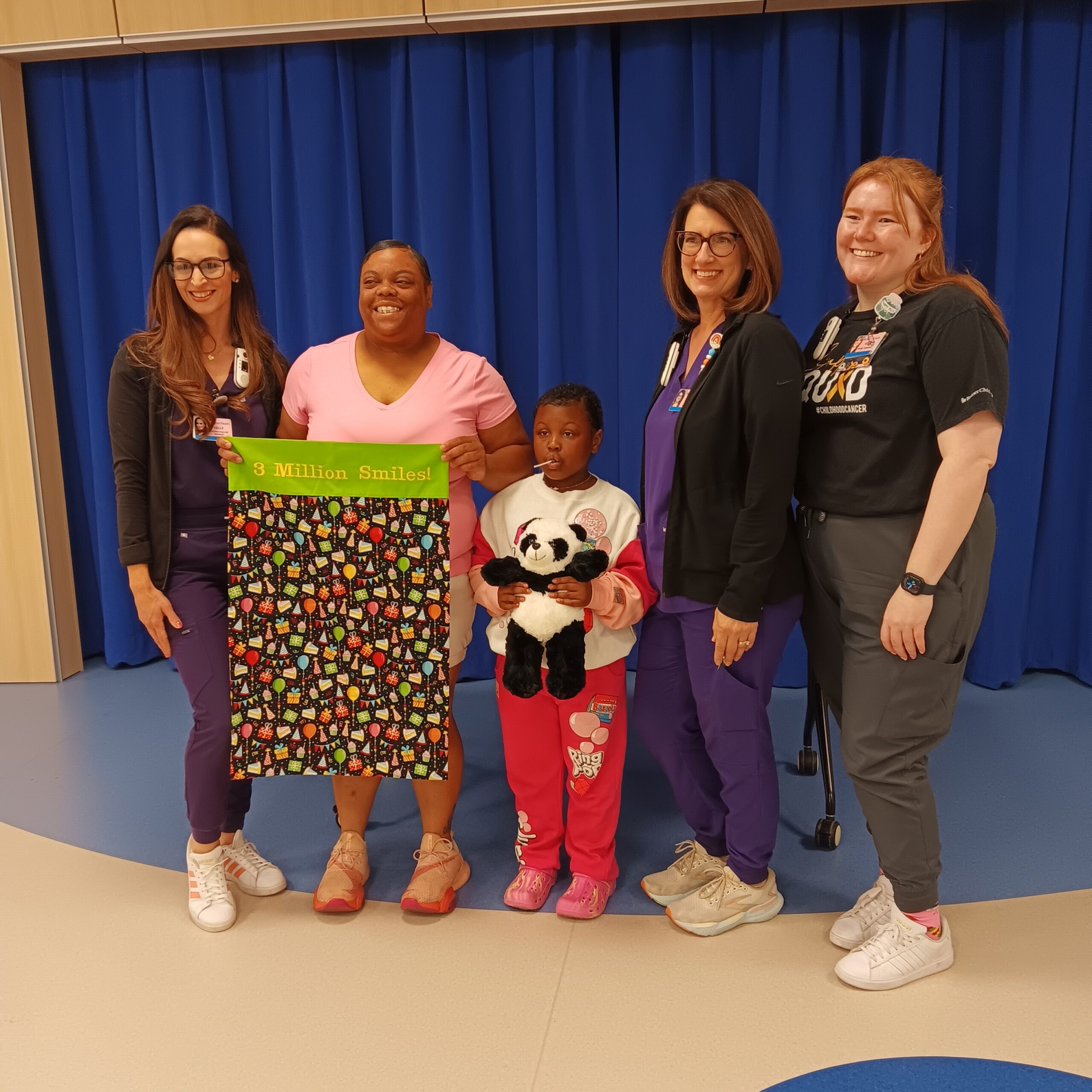 Meet Asha, a vibrant and resilient 7-year-old who received our celebratory 3 millionth pillowcase at Banner Children’s at Desert Mountain Hospital in Phoenix, Arizona. Full of spunk and sunshine, Asha has already overcome incredible challenges. Early in her diagnosis, her family wasn’t sure if she would ever walk or talk again. But after 217 days as an inpatient, she’s now an outpatient—and thriving. Her joy and excitement at the presentation were contagious, making this milestone moment even more meaningful.